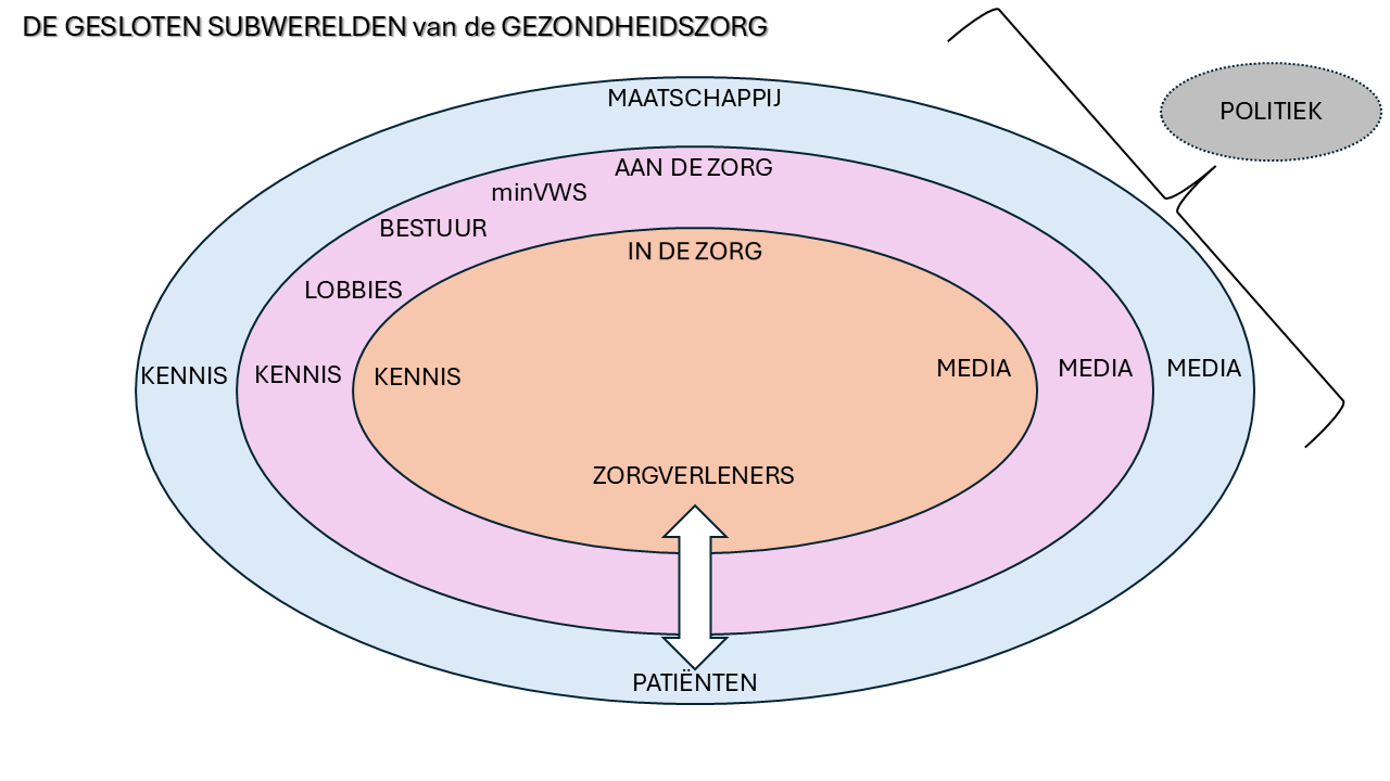 In de tussenwereld (‘Aan de Zorg’) zit de samengebalde macht die de zorg bestuurt, reguleert, financiert, controleert, evalueert. De overheid in brede zin: het ministerie VWS (Rijksoverheid), de NZA, het Zorginstituut, de Inspectie GJ en de andere toezichthouders en de gemeenten (inkopers WMO, Jeugdzorg). Maar ook de marktpartijen in al hun verscheidenheid, waaronder de zorgverzekeraars en zorgkantoren als inkopers van de zorg met een wettelijke status. Verder: de belangenorganisaties van zorgverleners, van de academische ziekenhuizen tot en met de huisartsen en de verpleegkundigen, enzovoorts. De talrijke bestuurlijke verbanden. Maar ook de private belangenclubs hebben zich er genesteld. Het is teveel om op te noemen. Wezenlijk is dat deze tussenwereld een ijzeren greep heeft op de daadwerkelijke zorgverlening – in de binnenwereld. De ‘beheerskosten’ zijn enorm.6 En de tussenwereld beschikt over eigen media.7 De marktgedreven zorg zit in de haarvaten van de tussenwereld. Informatie is versnipperd. De genoemde kengetallen worden niet opgepikt. Medisch Contact, Zorgvisie e.d. zijn niet geïnteresseerd. Zijn de harde outcome-cijfers een bedreiging voor de status quo?