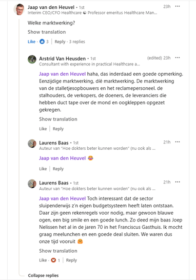 De binnenste wereld vormt het hart van de zorg (‘In de Zorg’), van huisarts tot en met ziekenhuiszorg, thuiszorg, apotheek, publieke gezondheidszorg. Maar ook de medische wetenschap, kennisdeling, media en communicatie. Op LinkedIn zijn veel zorgverleners actief, er zijn podcasts etc. Het boek van Girbes is een cri de coeur uit de binnenwereld.