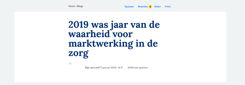Wat evenmin de aandacht van de media heeft is dat langzaam maar zeker de marktwerking in de zorg wordt teruggedrongen. Het gebeurd in de acute zorg (het samenspel tussen 1e- en 2elijnszorg, huisartsen(-posten) <> SEH ziekenhuizen), maar ook in de gespecialiseerde ggz en de jeugdzorg neemt de landelijke overheid de regie meer in handen.3 Het wordt niet opgepikt door de landelijke media, die zeker 15 jaar lang opeenvolgende bestuurders hebben laten vertellen dat de gereguleerde marktwerking de beste vorm is. De uitspraak van voormalig premier Mark Rutte ligt nog vers in het geheugen: “We hebben de beste zorg van de wereld”. De fundamentele koersverandering van de mammoettanker van de zorg is kennelijk nog niet in het vizier.