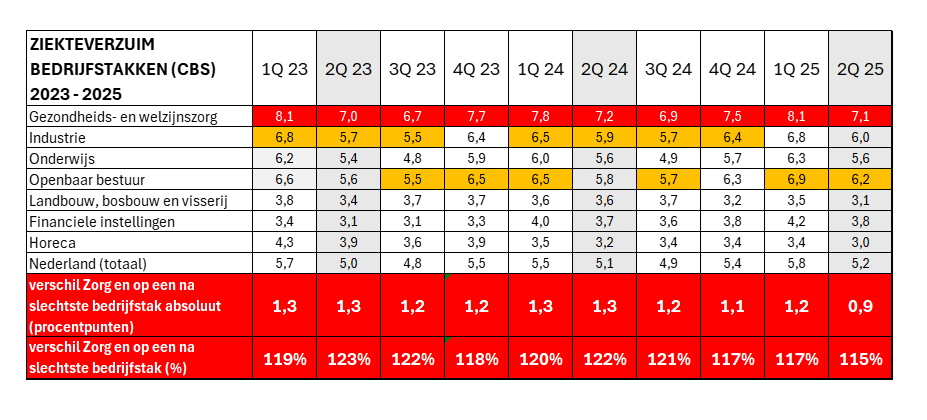 Het ziekteverzuim in de bedrijfstak Gezondheidszorg blijft met 7,1% (slechts 0,1% lager dan een jaar geleden) veruit het hoogste van alle bedrijfstakken NL.