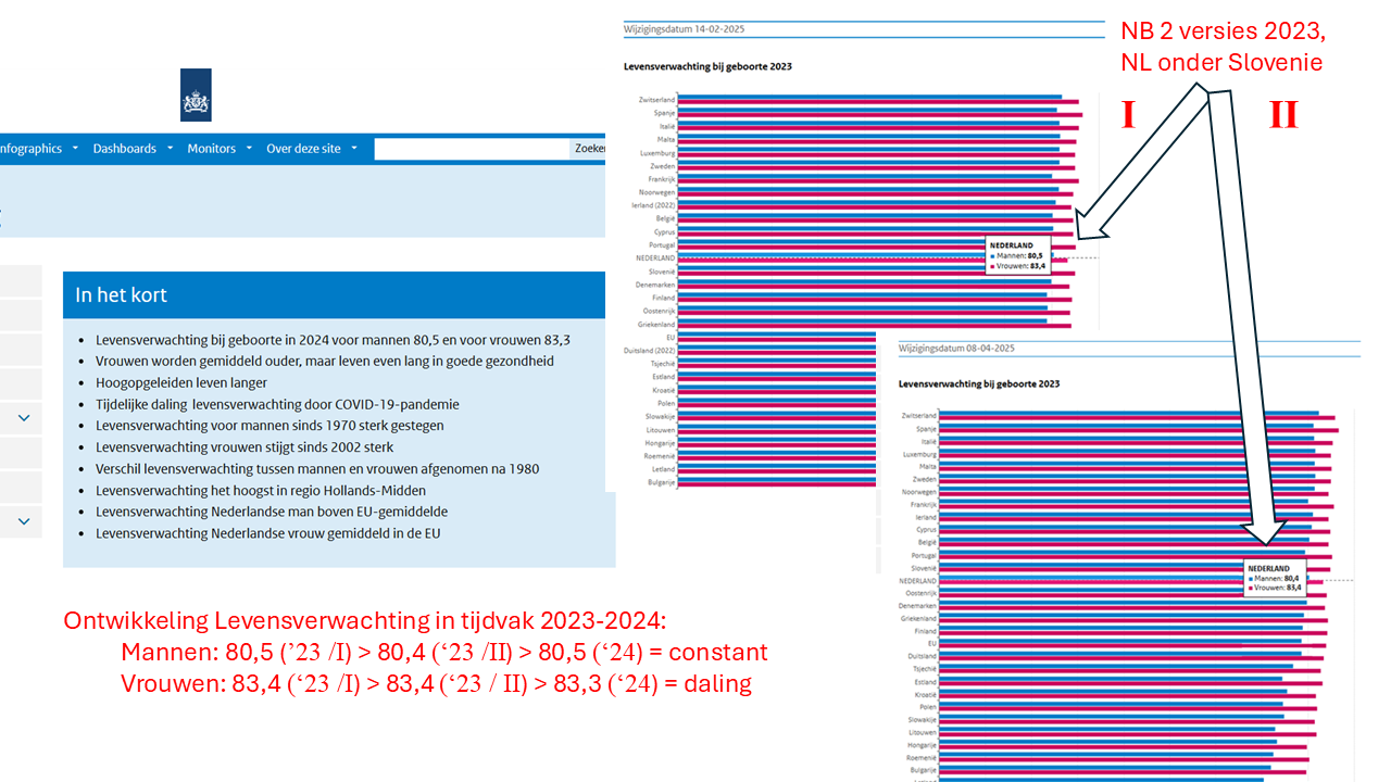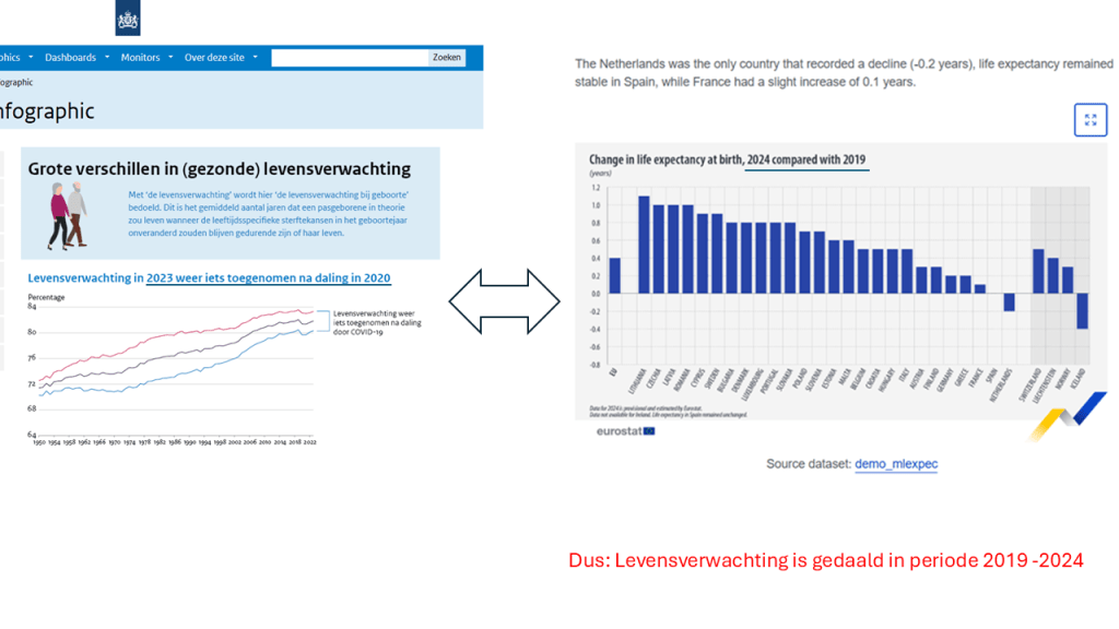 In de nieuwsbrief van het RIVM van 25 sept. staat onder andere een link naar nieuwe informatie over de Levensverwachting bij geboorte. In een drietal samengestelde afbeeldingen van screenshots laat ik delen van de webpagina’s van het RIVM zien en vergelijk deze informatie met eerdere pagina’s en webpagina’s van Eurostat die twee weken eerder op 11 sept. zijn gepubliceerd. In de afbeeldingen staat commentaar in rood en er zijn enkele pijlen ingetekend.