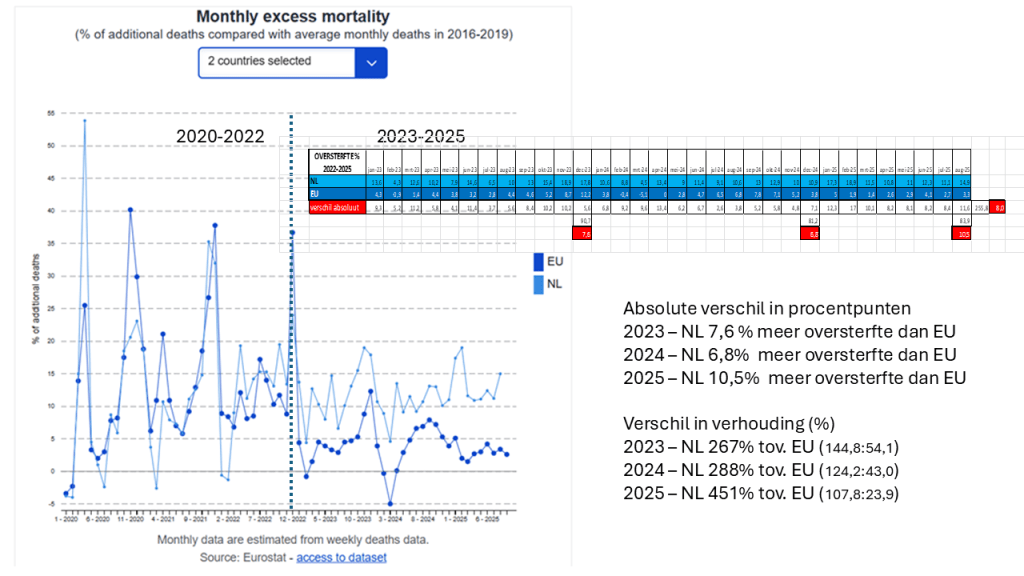 In het 1e tijdvak, de drie ‘officiële’ coronajaren, fluctueerden de maandelijkse sterftecijfers van de EU-landen enorm. Gemiddeld genomen waren de totalen van de EU en NL vergelijkbaar over het gehele tijdvak. Maar vanaf het begin van het 2e tijdvak is de maandelijkse oversterfte NL veel hoger dan het EU-gemiddelde. Zie de grafiek. De stippellijn matrkeert de grens tussen de twee tijdvakken. Het verschil tussen NL en de EU is nog niet zo groot geweest als dit jaar. Tot en met augustus 2025 is de NL-oversterfte iedere maand tien-en-een-half (10,5%) volle procenten hoger dan het EU-cijfer. Dit is zonder twijfel een ongelooflijk feit – het is de waarheid!