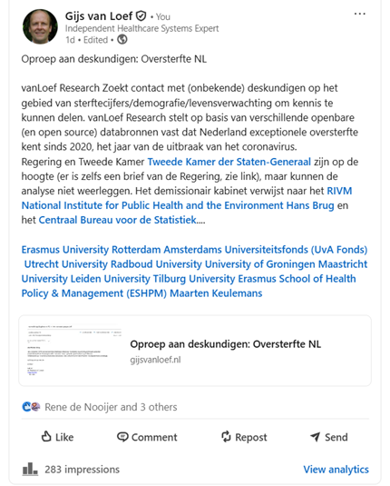 vanLoef Research Zoekt contact met (onbekende) deskundigen op het gebied van sterftecijfers/demografie/levensverwachting om kennis te kunnen delen. vanLoef Research stelt op basis van verschillende openbare (en open source) databronnen vast dat Nederland exceptionele oversterfte kent sinds 2020, het jaar van de uitbraak van het coronavirus. Regering en Tweede Kamer zijn op de hoogte (er is zelfs een brief van de Regering, zie link), maar kunnen de analyse niet weerleggen. Het demissionair kabinet verwijst naar het RIVM en het CBS.