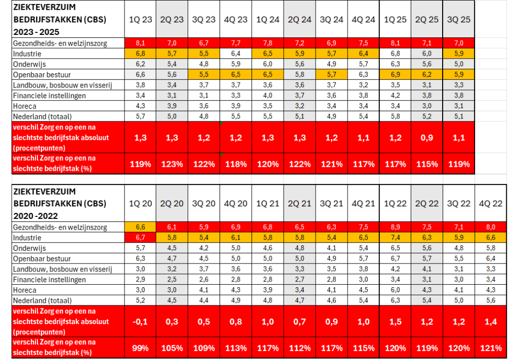 Het ziekteverzuim blijft van alle bedrijfstakken veruit het hoogste in de gezondheidszorg: 7%. Dit is 37% meer dan het gemiddelde verzuimcijfer van Nederland (5,1%). Het verschil met bedrijfstakken met het op-een-na-hoogste verzuimpercentage (Industrie en het Openbaar bestuur) is 1,1 vol procentpunt. Dit is 19% meer (119%, zie tabel met alle kwartalen vanaf 1Q2020). Vanaf het 2e kwartaal 2020 is het ziekteverzuim – veruit – het hoogste in de zorg.