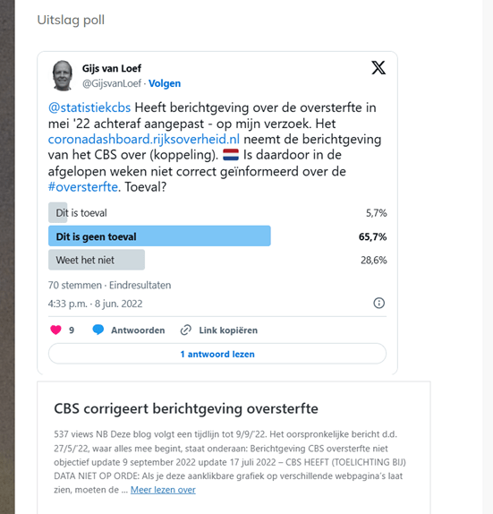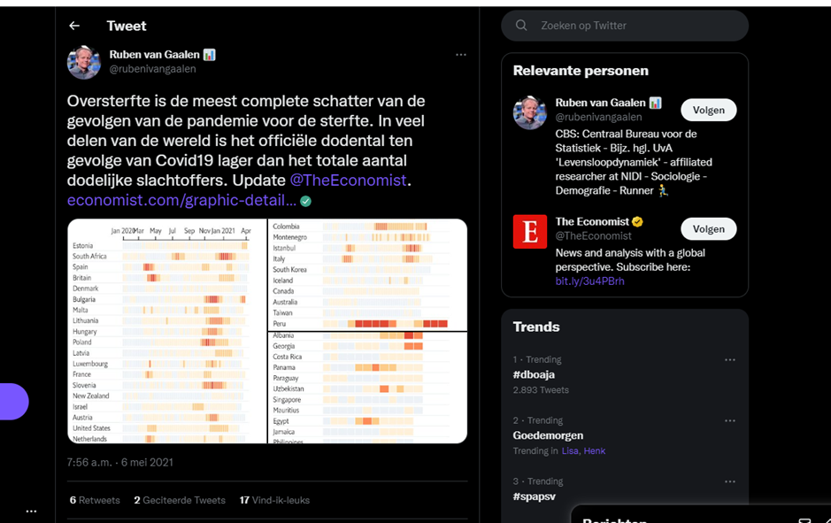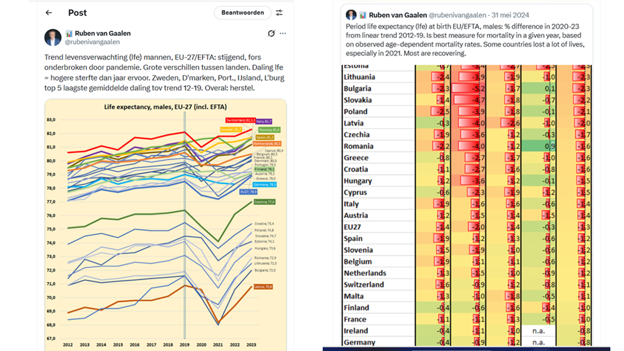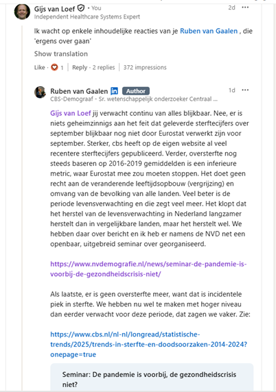 Ruben op LinkedIn: “Jij verwacht continu van alles blijkbaar. Nee, er is niets geheimzinnigs aan het feit dat geleverde sterftecijfers over september blijkbaar nog niet door Eurostat verwerkt zijn voor september. Sterker, cbs heeft op de eigen website al veel recentere sterftecijfers gepubliceerd. Verder, oversterfte nog steeds baseren op 2016-2019 gemiddelden is een inferieure metric, waar Eurostat mee zou moeten stoppen. Het doet geen recht aan de veranderende leeftijdsopbouw (vergrijzing) en omvang van de bevolking van alle landen. Veel beter is de periode levensverwachting en die zegt veel meer. Het klopt dat het herstel van de levensverwachting in Nederland langzamer herstelt dan in vergelijkbare landen, maar het herstelt wel. We hebben daar over bericht en ik heb er namens de NVD net een openbaar, uitgebreid seminar over georganiseerd.