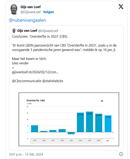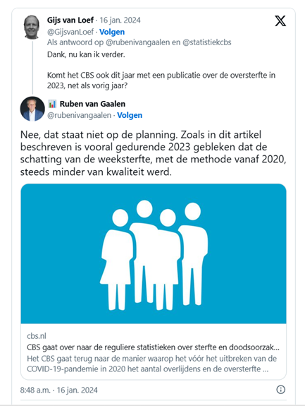 Januari 2024 – Komt er wel of geen oversterfte rapportage 2023 van het CBS? Lees hier hoe het gegaan is, eerst op twitter.