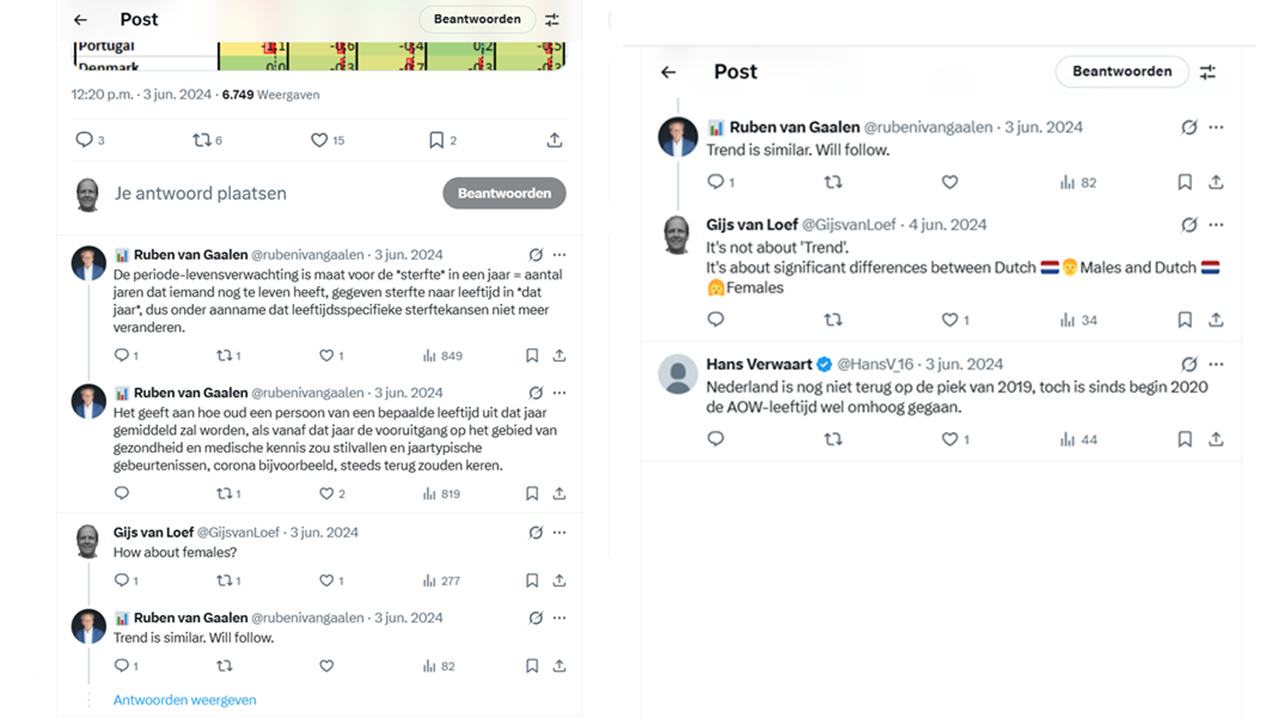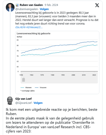 Januari 2023 – Je bent actief op twitter – Ik stel jouw verwachting over de stijgende levensverwachting ter discussie – je reageert niet. Zoals we inmiddels weten is de levensverwachting in de afgelopen jaren (2019-2024) alleen in Nederland gedaald.
