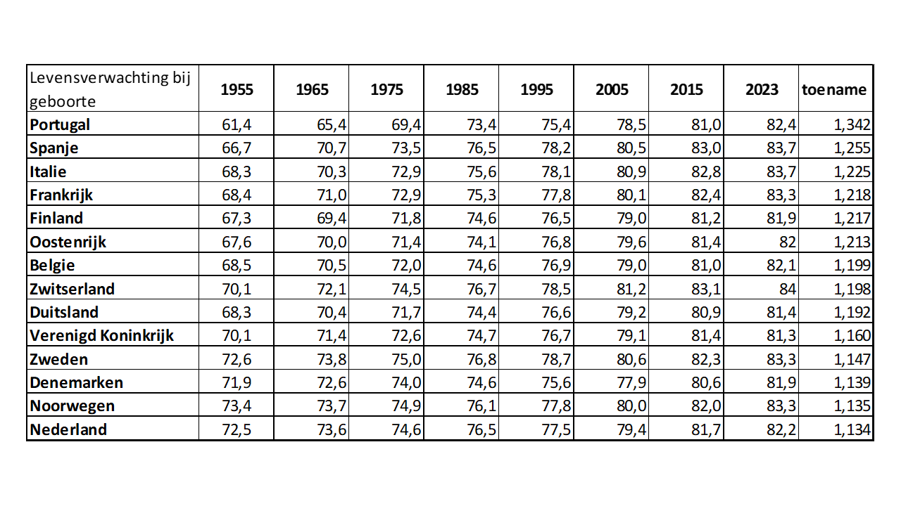 3e item – De ontwikkeling van de levensverwachting bij geboorte in West-Europa vanaf 1955 tot heden. Nederland heeft de laagste groei/toename van alle veertien landen (13,4%). Bron: Reactie op beslisnota/brief kabinet over ‘Waarom is de oversterfte in Nederland zo hoog?’, vanLoef Research (mei ’25)