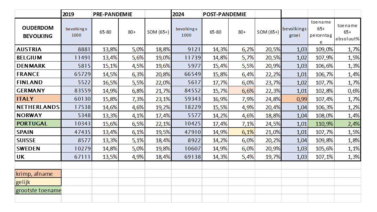 1e item – Vergrijzing in West-Europa, veertien landen. Nederland behoort tot de minst vergrijzende landen (20,4% 65+ in 2024). Bron: Waarom is de oversterfte in Nederland zo hoog?, vanLoef Research (dec. 2024)