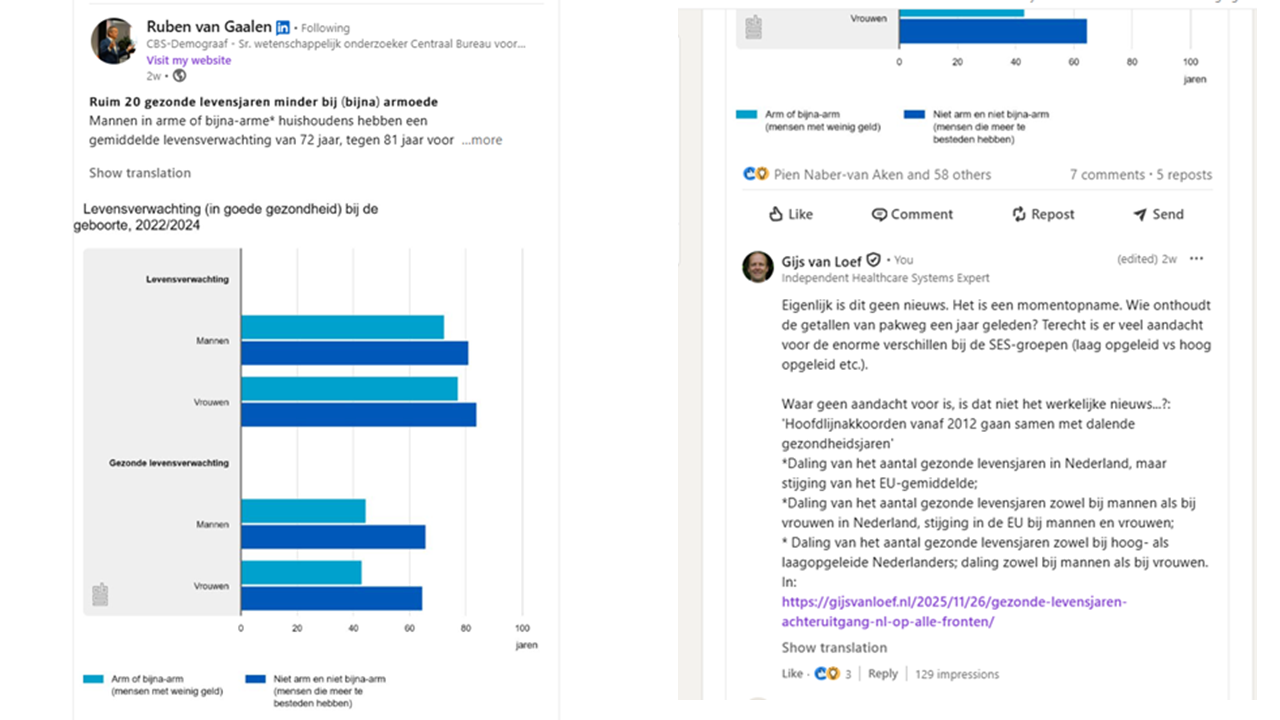2e item – Reactie op andere post van Ruben: ‘Ruim 20 gezonde levensjaren minder bij (bijna) armoede. Bron: LinkedIn. Mijn reactie: “Eigenlijk is dit geen nieuws. Het is een momentopname. Wie onthoudt de getallen van pakweg een jaar geleden?” Ik geef daarna aan wat m.i. werkelijk nieuws zou moeten zijn en verwijs naar een aparte publicatie op mijn website: