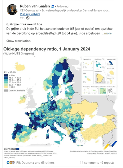 Ik citeer uit eigen bron: ‘De sterfte is in alle West-Europese landen lager dan in Nederland. Nederland is het enige land waar de oversterfte in 2024 nog 10% – 15% bedroeg (baselines @Eurostat en @Ourworldindata), in de andere landen – waar de vergrijzing meestal groter is dan 6,3% (NL) – is de (resterende) oversterfte aanzienlijk lager en soms zelf geheel verdwenen. Zie de grafieken Excess Mortality Pandemic Years 2020-2024‘. Kort gezegd, de grijze druk/vergrijzing is overal in West-Europa, maar nergens is de oversterfte aanhoudend zo hoog als bij ons. (Lees verder in:)