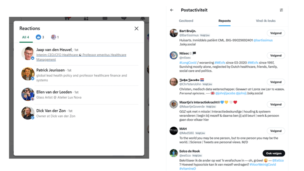Likes van verschillende personen die zich ‘zorgstelseldeskundige’ noemen – Reactie Henk Koudijs onder