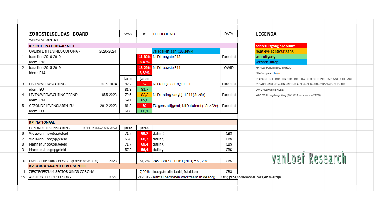 Een internationale vergelijking van de belangrijkste resultaten/uitkomsten (outcomes) van het Nederlandse zorgstelsel op drie Key Performance Indicators: a. Oversterfte sinds corona; b. Levensverwachting bij geboorte (sinds corona); c. Gezonde levensjaren. Plus enkele landelijke KPI’s: d. oversterfte bevolkingsgroep WLZ; e. ziekteverzuim zorgsector; f. arbeidstekort zorgsector.