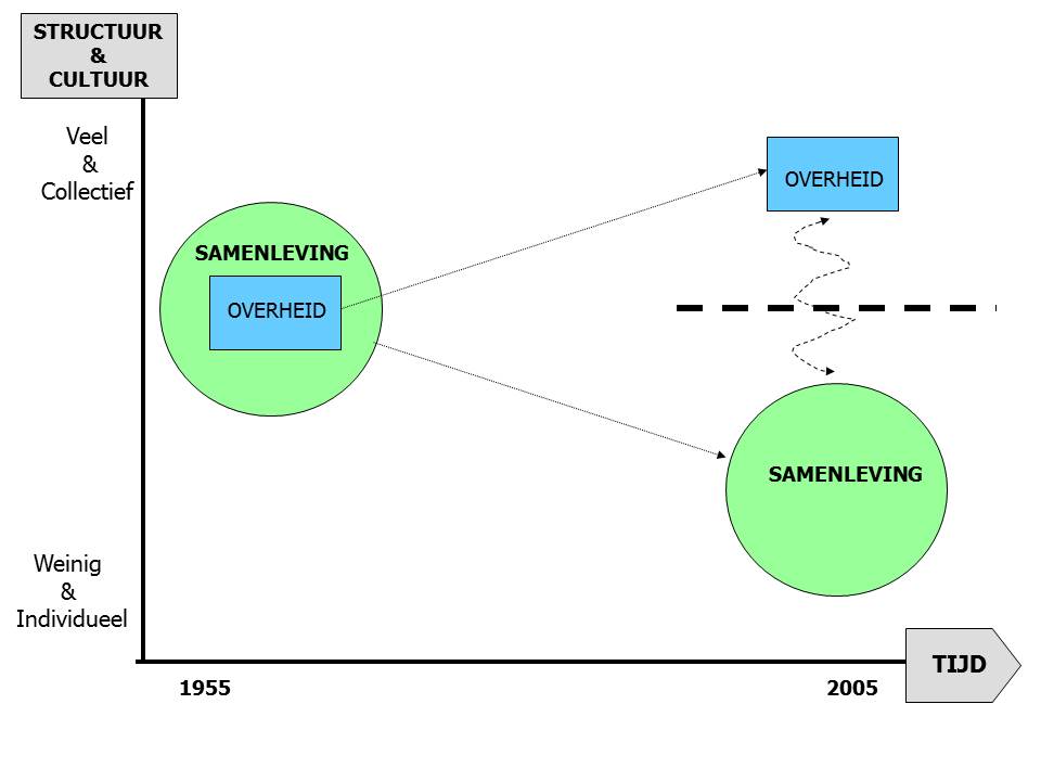 Tegenover de ontwikkeling van de mensen en de samenleving staat een complexe Verzorgingsstaat die door de overdaad aan interne structuren, de verkokering, de steeds weer veranderende regelbrei, de eindeloze procedures en vooruitschuifmechanismen, de fixatie op control en prestatiegetallen, helemaal in zichzelf verstrikt is geraakt. Het teveel aan harde normen, bureaucratie en regelzucht van de overheid biedt geen tegenwicht voor het sociale tekort. In zijn zoektocht naar een leefbaarder samenleving verwachtten burgers en ingezetenen steun van een gezagvolle overheid, een overheid die betrouwbaar is, integer, een overheid die rechtszekerheid biedt en die maatschappelijke problemen oplost. Maar wat de mensen krijgen is het tegenovergestelde: een onbetrouwbare overheid, een overheid die argwanend is en betuttelend en bovenal een overheid met een ontstellend gebrek aan oplossend vermogen.