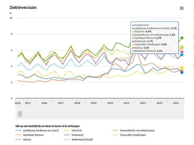 In de gezondheids- en welzijnszorg bedroeg het ziekteverzuim in het 4e kwartaal 2024 7,5 procent. Het is veruit het hoogste percentage van de 7 hoofdbedrijfstakken. Het verschil met de bedrijfstak Industrie (met het op een na hoogste verzuimpercentage) bedraagt structureel meer dan een vol procentpunt. Sinds 2020, het jaar van de corona uitbraak, heeft de zorgsector veruit het hoogste ziekteverzuim van alle bedrijfstakken.