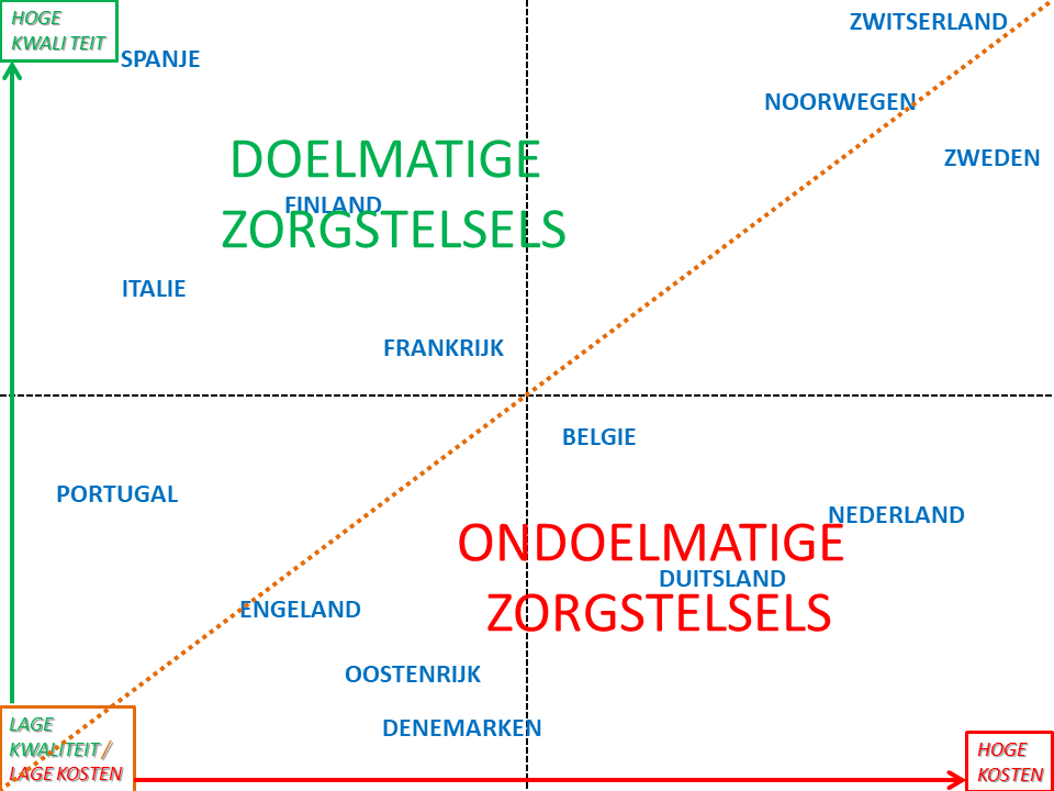 Illustratie: Nederland heeft het meest ondoelmatige zorgstelsel van heel Europa, uitgezonderd de Baltische Staten en Ukraine. Oftewel, we verspillen het meeste zorggeld van alle landen (m.u.v. de genoemde), geven het geld uit aan de verkeerde zaken. Gemeten op basis van Health-adjusted Life expectancy (HALE) en de bruto zorguitgaven.