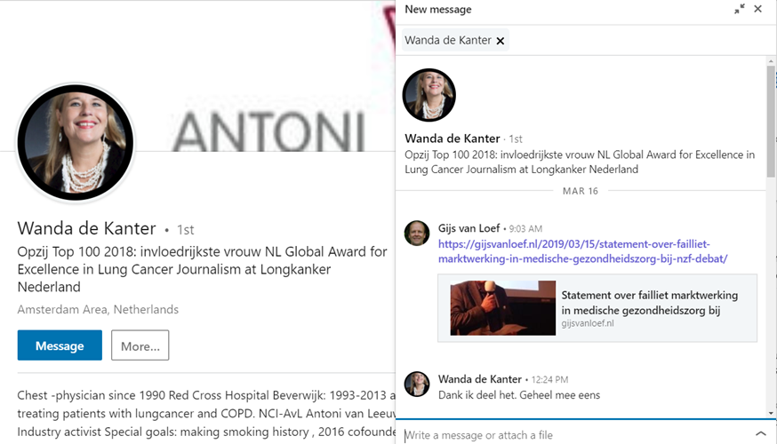 “Kritisch tegengeluid over de ongepaste zelfverheerlijking over “het beste systeem ter wereld”. In het Frans zeggen we: ‘on n’est jamais mieux servi que par soi-même’. Onze gezondheidszorg is op veel fronten inderdaad niet zo slecht, maar het gaat achteruit in kwaliteit. Vraag dat aan de patiënt met de diagnose kanker die heel lang moet wachten op de MRI of de operatie, of de patiënt die binnen 23 uur na de faillietverklaring van het Slotervaart als een DHL pakketje overgeplaatst moest worden, of de ziekenhuispatiënt die niet overgeplaatst kan worden naar een revalidatiecentrum of verzorgingstehuis omdat er geen plaats is. Of de MS patiënt die geen stamceltransplantatie vergoed kan krijgen voor zijn/haar specifieke vorm van MS, maar wel tegen eigen betaling in gerenommeerde buitenlandse Europese academische ziekenhuizen kan worden geholpen. Of aan de dokters, die 40% van hun tijd aan administratie besteden en uren moeten bellen om de patiënt elders opgenomen te krijgen wegens plaatsgebrek. Dat is de praktijk. Die ijdele zelfverheerlijking door vooral mensen die langs de zijlijn staan van het echte speelveld, is ongepast. Gijs van Loef geeft een ander geluid waar de gesubsidieerde mooi-sprekers inhoudelijk op zouden moeten reageren.”