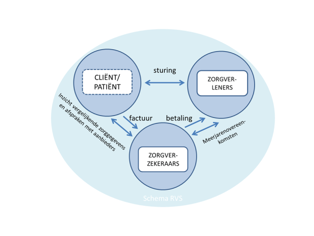 De Raad draait de driehoek letterlijk om en maakt in tekst en beeld de zorgverzekeraars ondersteunend/faciliterend aan de as patiënt-zorgverlener, waarbij budgettaire meerjarenafspraken met zorgverleners het uitgangspunt zijn. Ze constateert dat er allerlei waarborgen zijn waardoor er vertrouwen mag zijn (!) in het beoordelings- en handelingsvermogen van zorgprofessionals in hun interactie met de zorgcliënt. Alsof dat een eyeopener is.