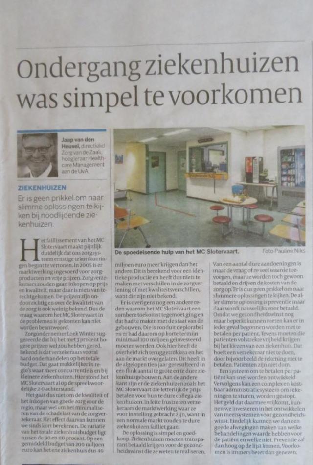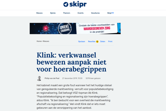 a. Hij gebruikt het woord ‘marktwerking’ zonder specifiek te zijn wat hij er precies onder verstaat. Er zijn allerlei vormen van marktwerking in de zorg, sommige zijn wenselijk, andere niet. Klink blijkt een meester in het creëren van een spook: het anti-marktwerking spook! Volgens mij is hij vooral bang dat we de marktwerking van en tussen zorgverzekeraars niet meer willen en dat begrijp ik vanuit zijn positie gezien heel goed. Want deze vorm van marktwerking blijkt inderdaad niet te kunnen werken Waarom de marktwerking de kwaliteit van de zorg uitholt;