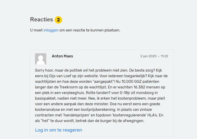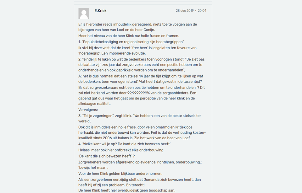 Tenslotte. Natuurlijk stelt dhr. Klink ook terechte vragen en zijn sommige antwoorden moeilijk. Maar wat ik zie is een zorgbestuurder die vastgeroest zit in zijn eigen gelijk, een eerlijk debat ontloopt en niet de neiging heeft om te willen luisteren naar een ander, nieuw geluid. Heeft hij al kennis genomen van dat onderzoek van IQ Healthcare?: ‘Laag vertrouwen in zorgverzekeraars in Nederland’ (december 2019). Voor bronnen en literatuur verwijs ik verder gemakshalve naar deze website gijsvanloef.nl, Zorgstelselexpert.”