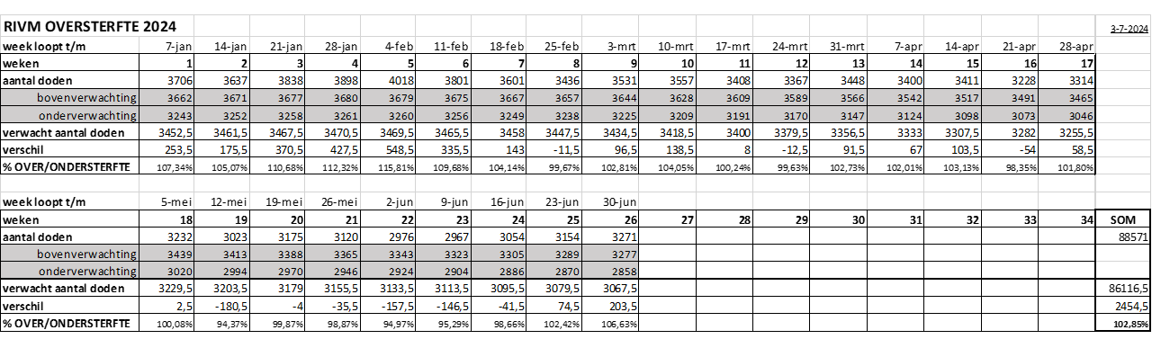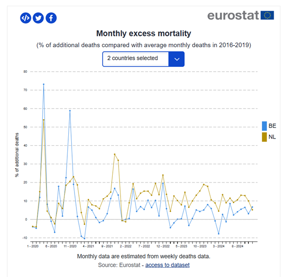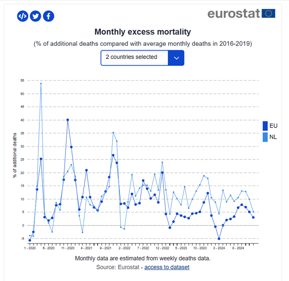 12e update, 18 juni 2025 – De herziene cijfers van Eurostat geven aanzienlijke hogere waarden bij de meeste landen, met Zwitserland als negatieve uitschieter. Alleen Finland en Italië komen lager uit. Toegevoegd is Ierland, dat in 2024 de hoogste oversterfte had: 12,1%. Daarna Nederland: 10,31%.