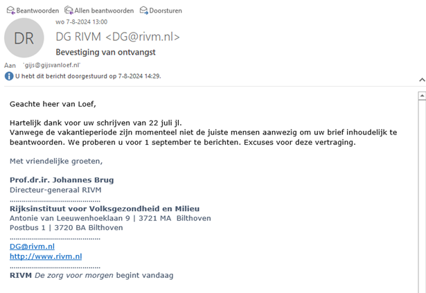 Op 14 augustus jl. het antwoord ontvangen van het RIVM op de brief. Met dank aan het RIVM.