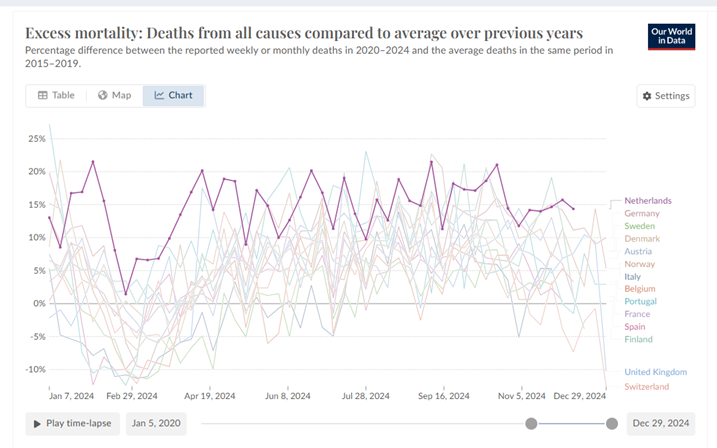 15e update, 29 april 2025 – Nederland heeft de hoogste oversterfte in 2024: 14,38%.