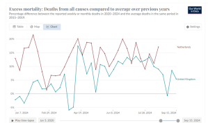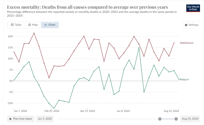 Nu, 11 juni 2024, is het verschil tussen ons land en de rest nog groter geworden (!). Het verschil met het UK – dat nu de op een na hoogste oversterfte heeft – is ruim 8,5 volle procentpunten. Met andere woorden: Nederland heeft meer dan driemaal meer oversterfte in 2024 dan het UK (319%). Belgie heeft een ondersterfte van bijna -2%.