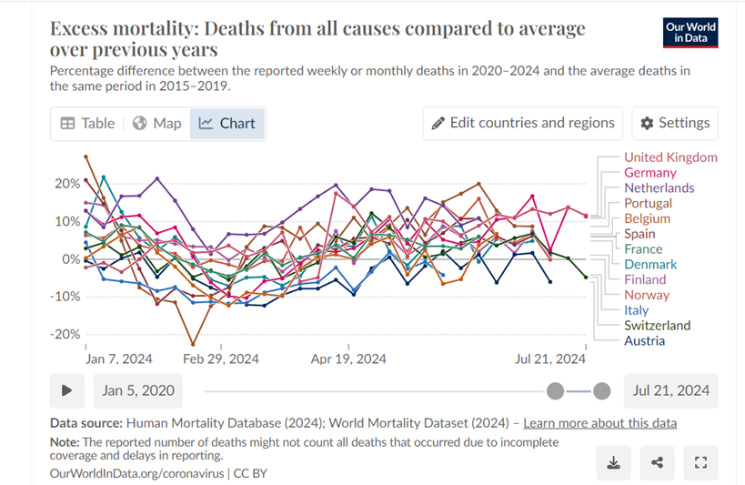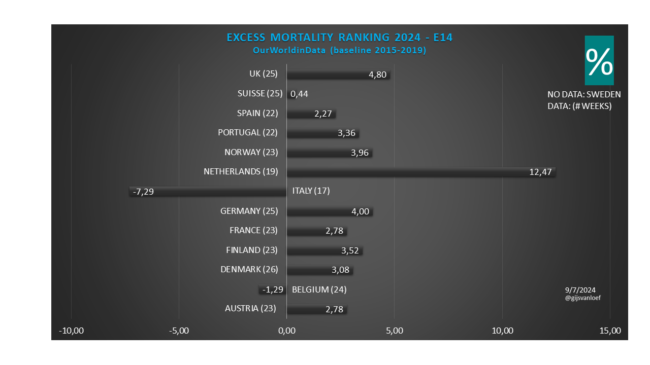 Bij de 13e update alleen kleine mincorrecties bij Oostenrijk en Denemarken. Verder ongewijzigd. Geen nieuwe cijfers Nederland. Nederland blijft in 2024 met 14,47% oversterfte tov. de referentieperiode 2015-2019 (baseline) veruit koploper – in negatieve zin. De groep ‘volgers’ (Noorwegen, Portugal, Finland, Duitsland) scoort tussen 8,23% en 7,54%, dat is bijna de helft van Nederland. België heeft 2,38% oversterfte. De oversterfte is verdwenen in Zweden en Italië.