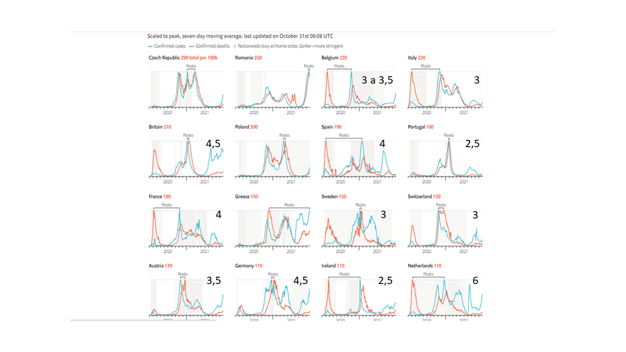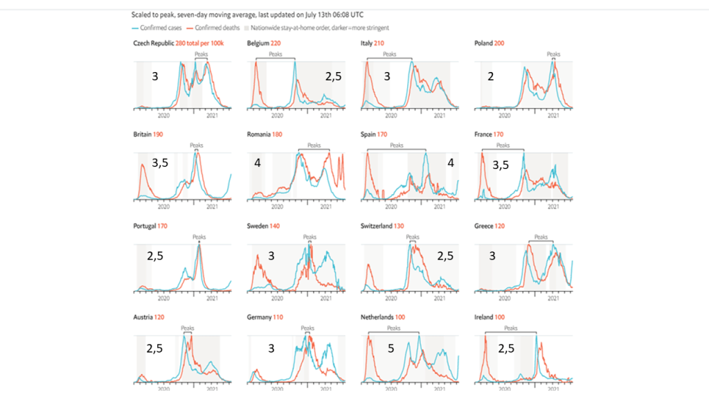 We zien dat sinds juli ’21 de volgende landen erin slagen om het aantal golven te bevriezen, je kunt zeggen dat ze daarmee nu succesvol zijn: Italie, Spanje, Portugal, Zweden en Ierland (geen EU14, toch meegenomen in de vergelijking; bij nadere beoordeling had Ierland maar 2 golven in juli).
