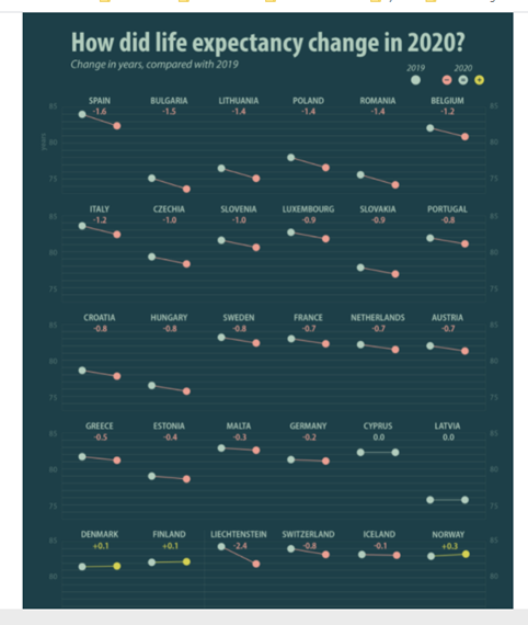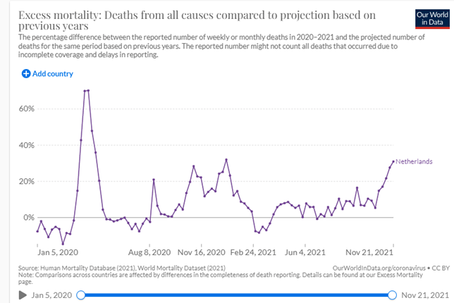 Excess mortality in the Netherlands. Bron: ourworldindata.org, 3 dec. 2021De levensverwachting is in 2020 gedaald met 0,7 jaar tov. 2019. Bron: Eurostat
